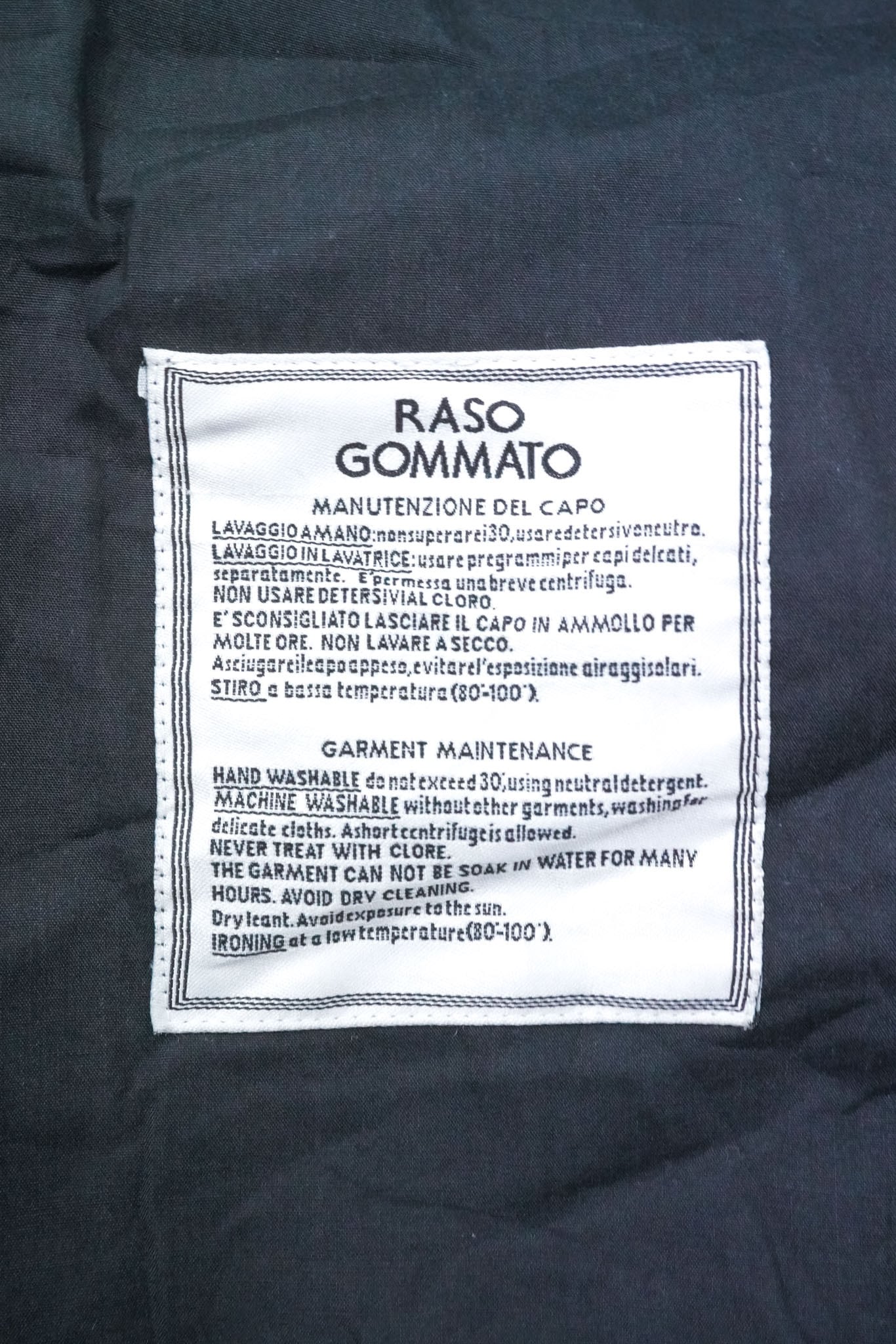 ストーンアイランドを代表する素材のひとつであるRASO-GOMMATOは、ミリタリーサテンをベースにポリウレタンフィルムをラミネートした複合素材。