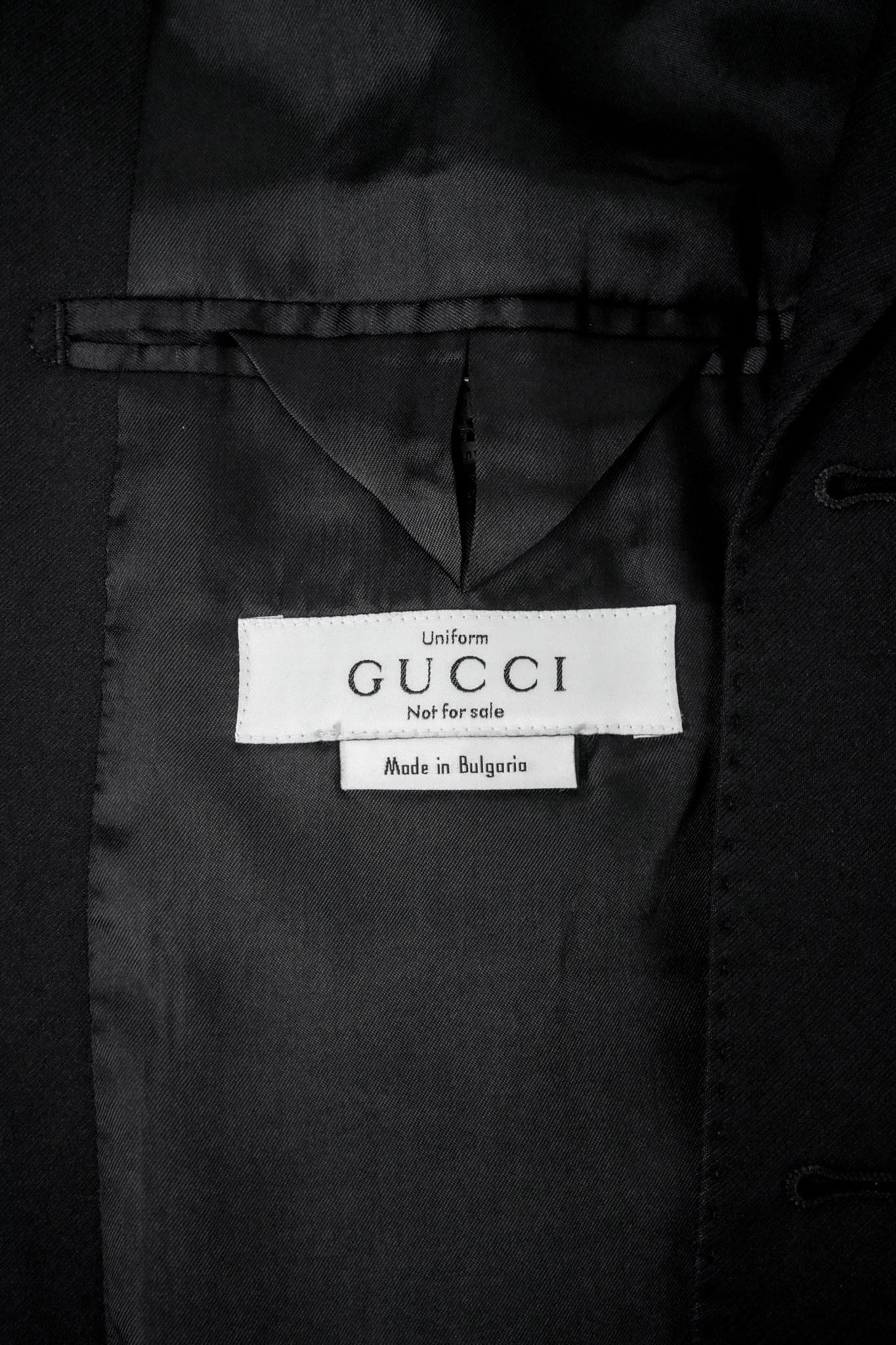 袖口にはGUCCI刻印のボタンが整然と並び、内側のタグには“Uniform GUCCI Not for sale”の文字。