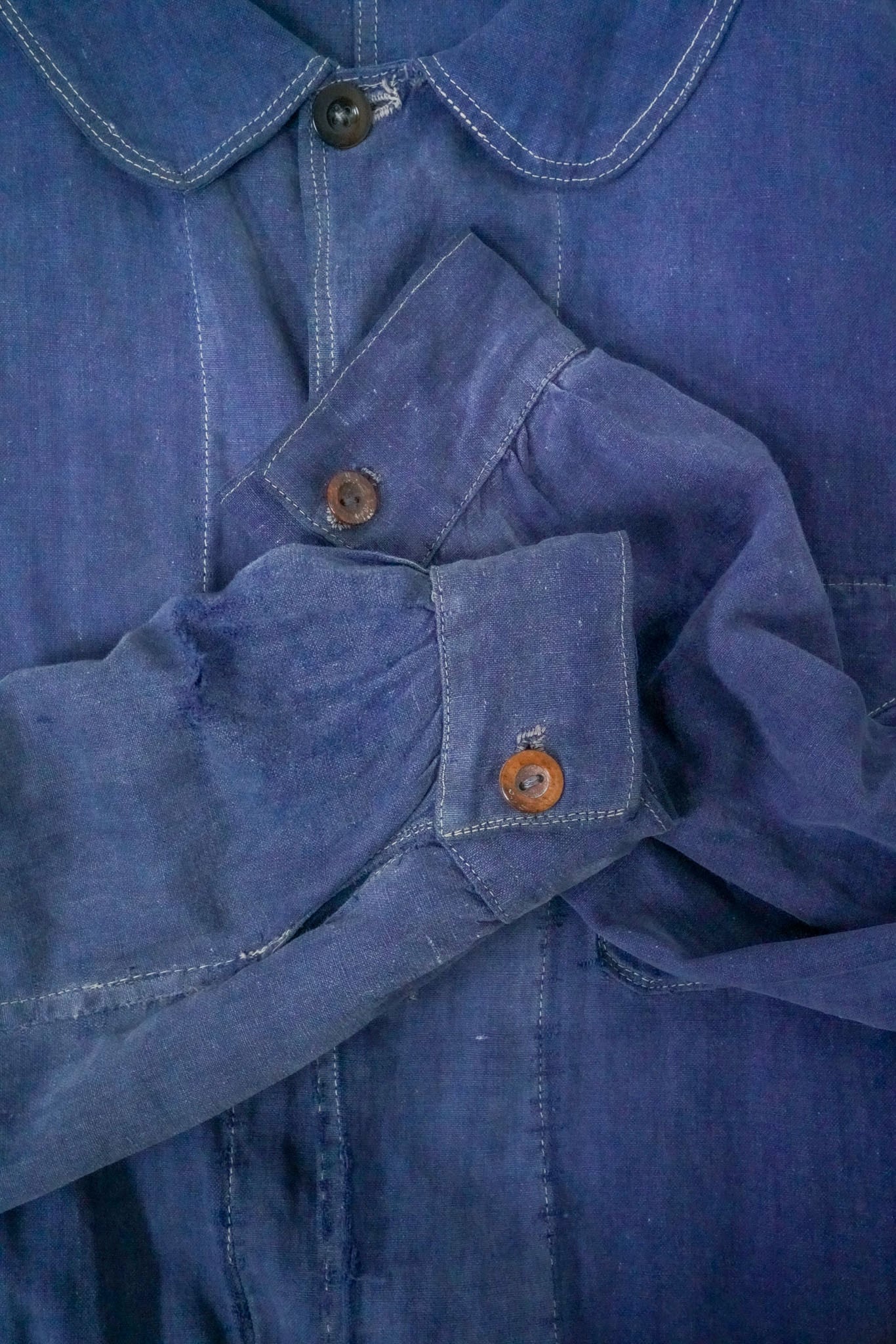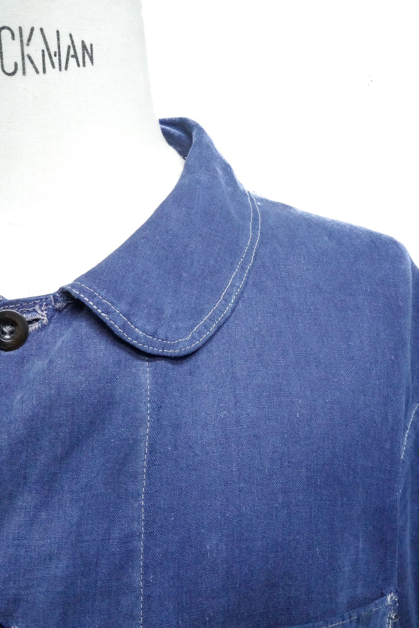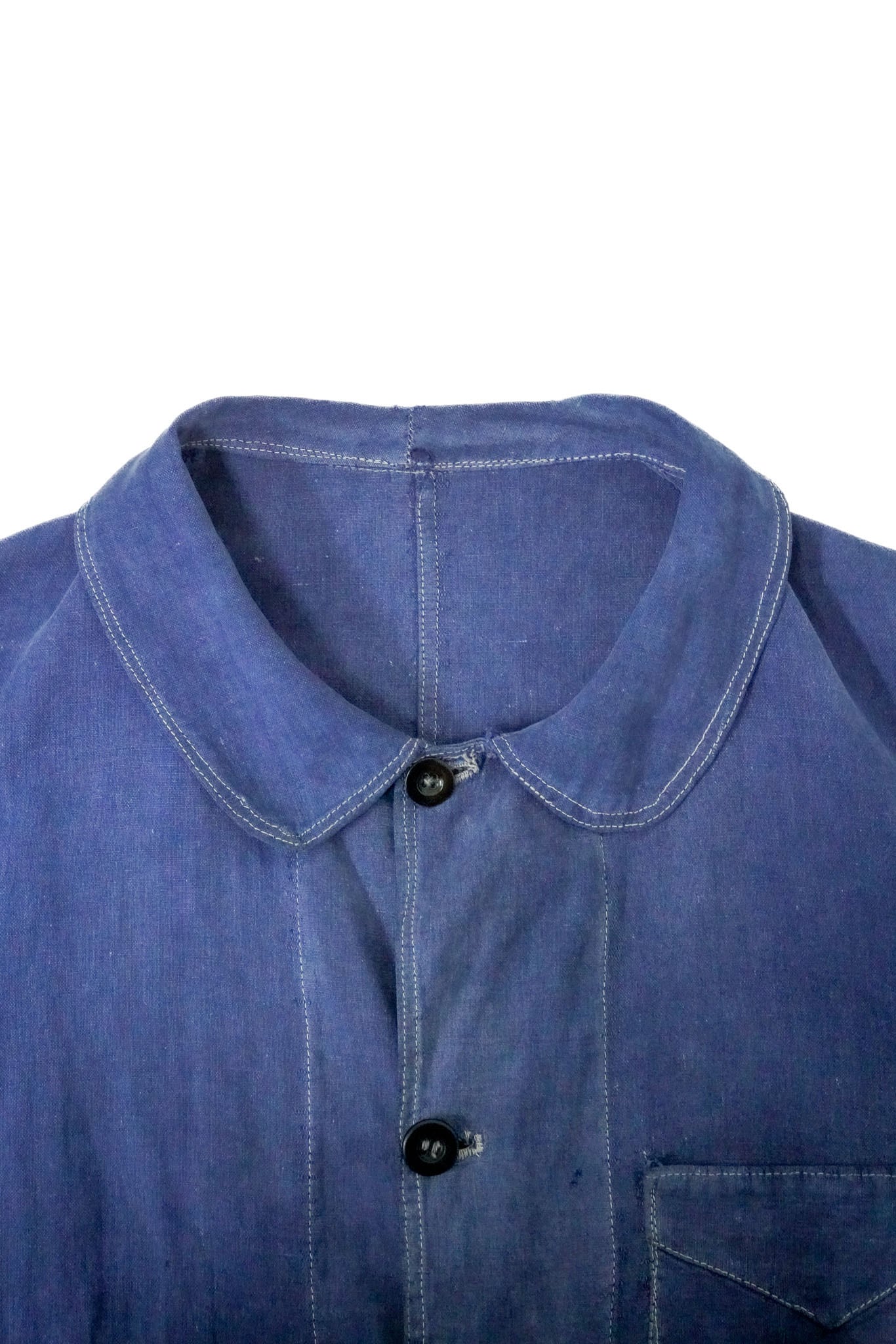 フレンチワークの世界において主流とされるのはコットンツイルやモールスキンですが、本品はそれらとは一線を画す"インディゴ染め"の"シルクリネン"を採用しています。