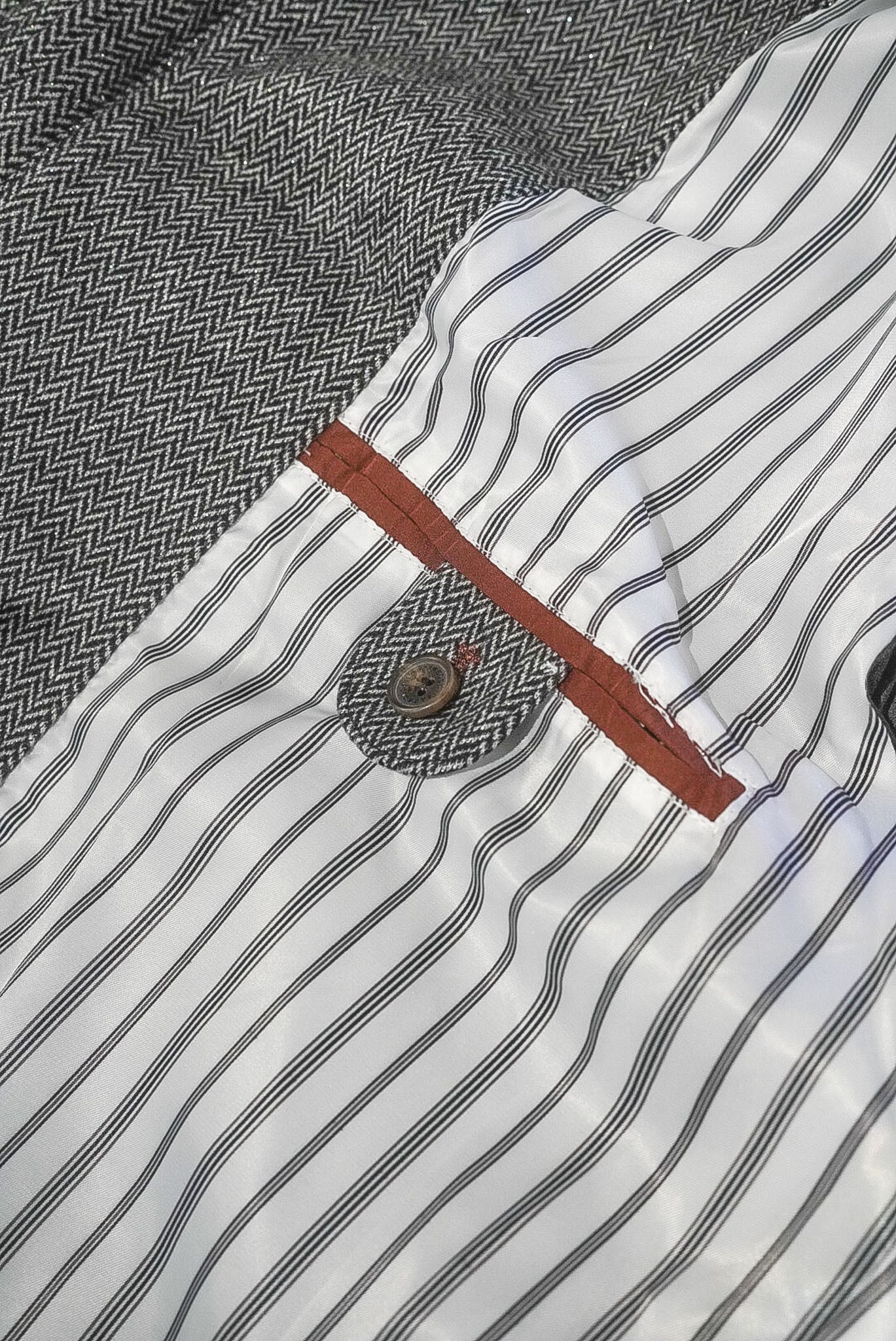 イタリアらしい感性が宿る絶妙なストライプの裏地は、見えない部分にこそ価値を置くブランドの哲学を体現しています。