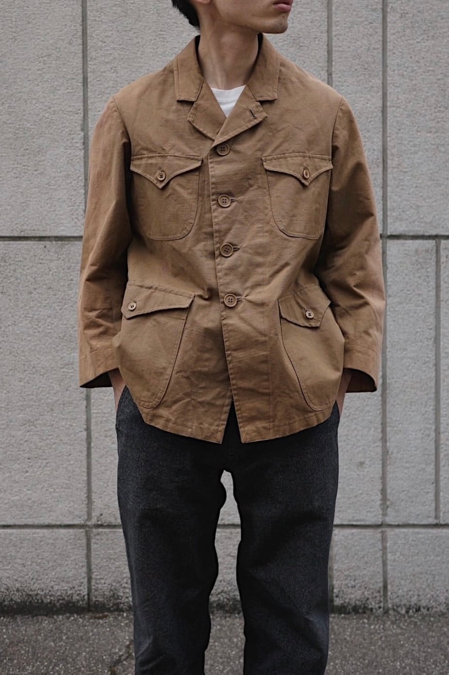 また後ろ下がりの肩傾斜や、湾曲して腕のラインに沿った立体的なアームが美しく素晴らしいパターンメイキングです。ややAライン気味の絶妙なシルエットで、ワークウェアですがスタイリッシュに着用頂けます。