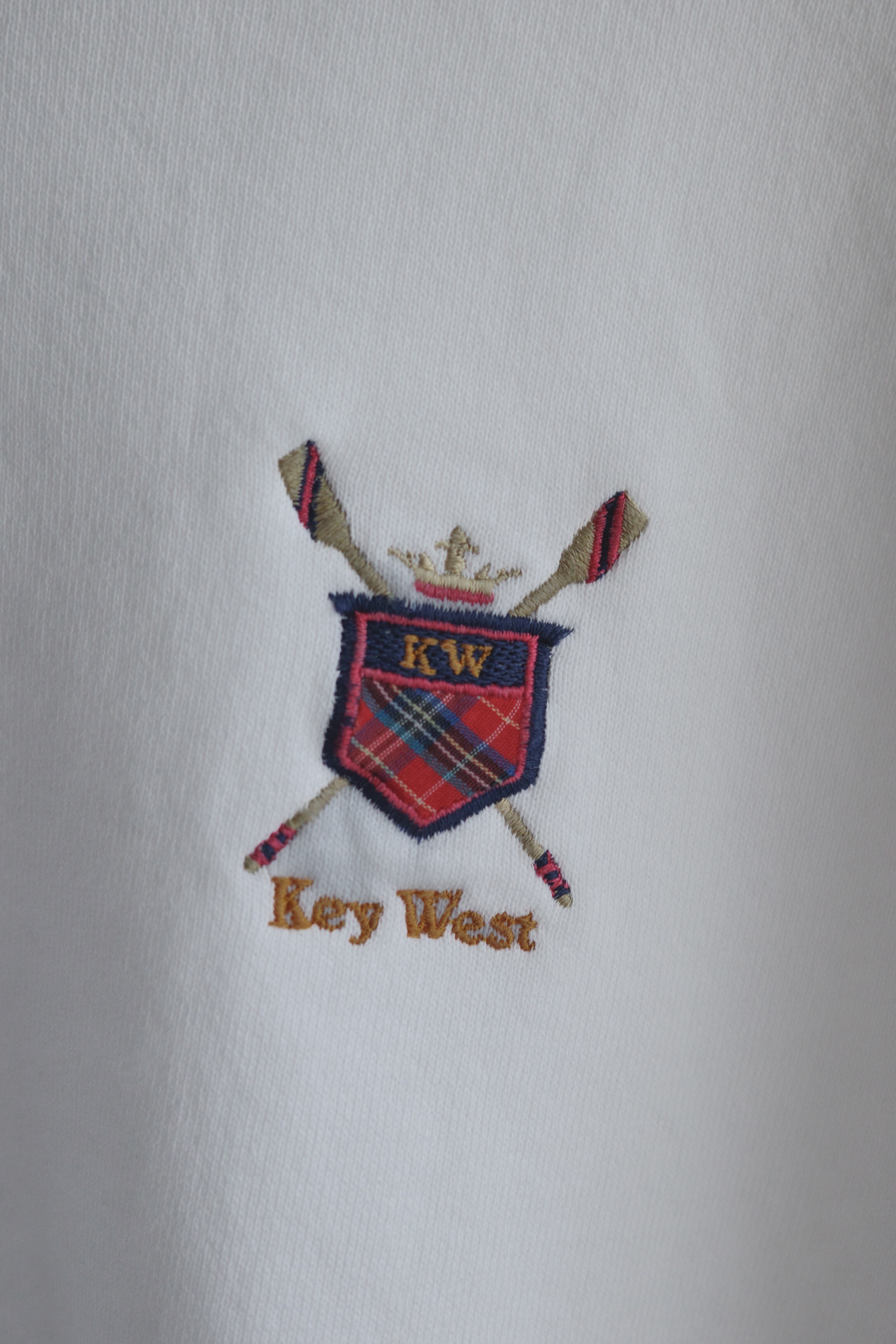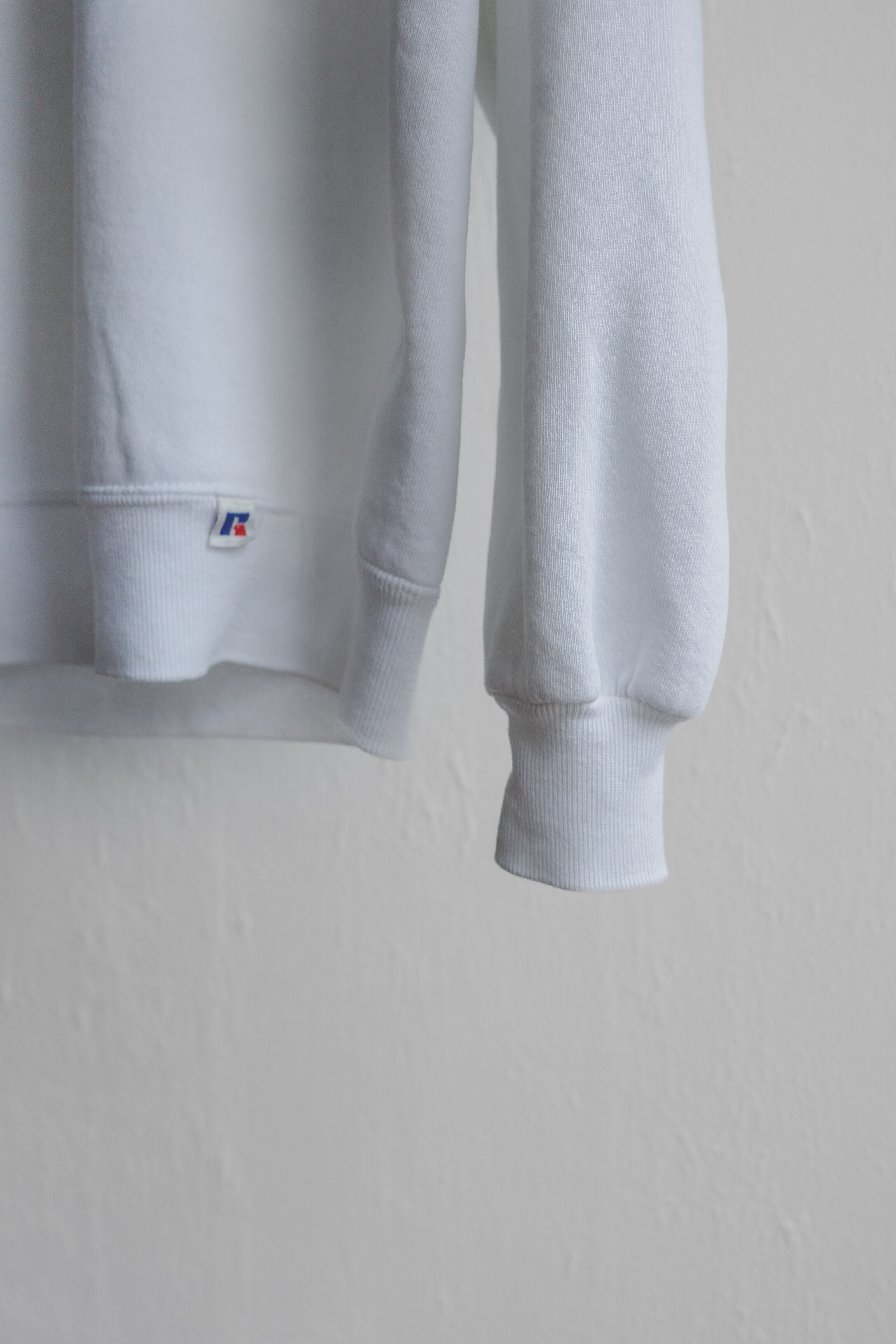 左胸にワンポイントの刺繍が施された本国USAメイドの白ボディスウェット