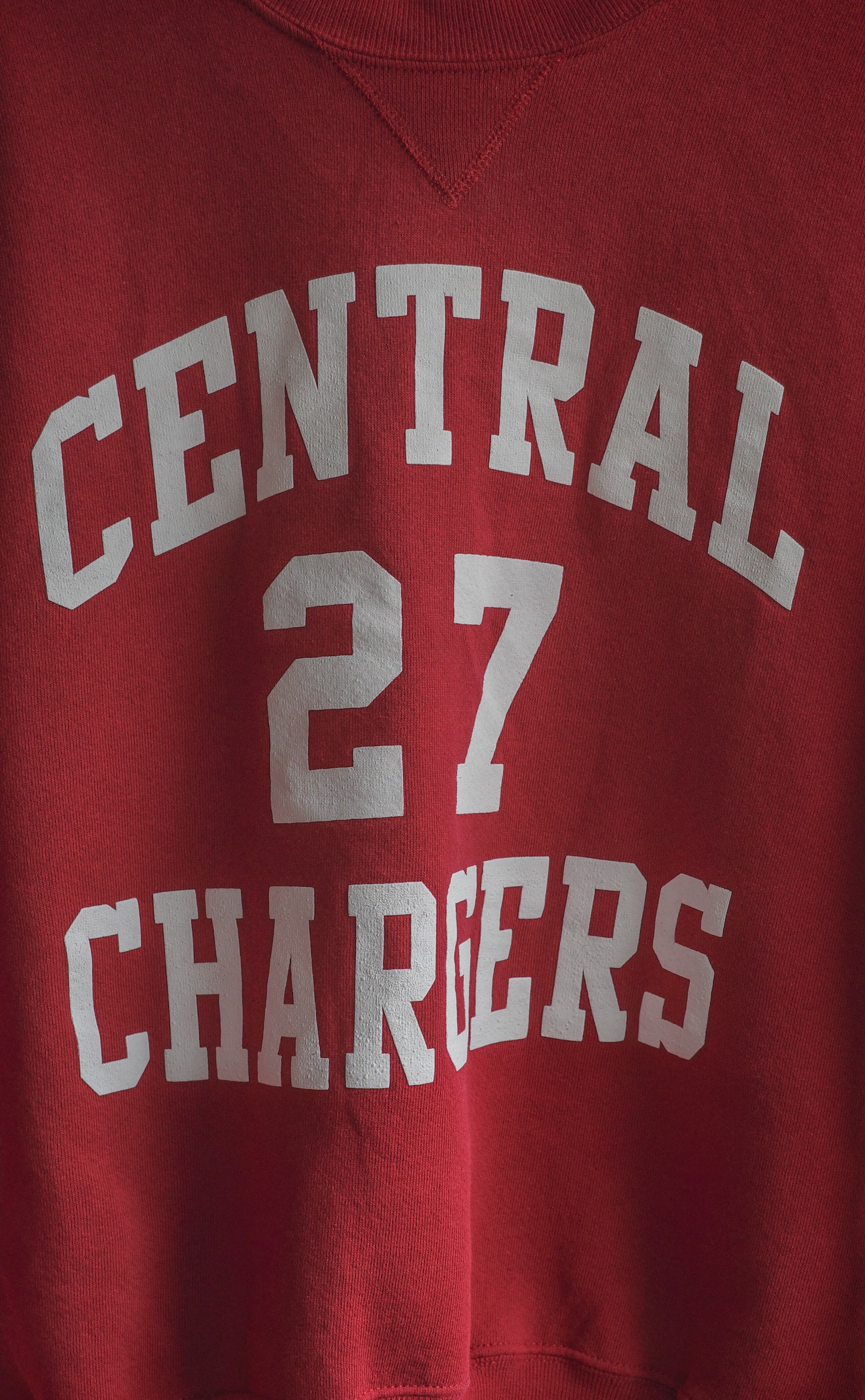 そしてこちらのアイテムは90年代の臙脂色(えんじいろ)ボディに「フロントV」とラバーで「CENTRAL 27 CHARGERS」と推測ですがスポーツチームのプリントが使用されています。スウェットといえばのデザインで古いスウェットデザインにも使用されている3段でプリントされた構成です。中心にプリントし且つ、ネックと裾周りのクリアランスも絶妙で全体のバランスが良く、プリントのカッコ良さを引き立たせます。