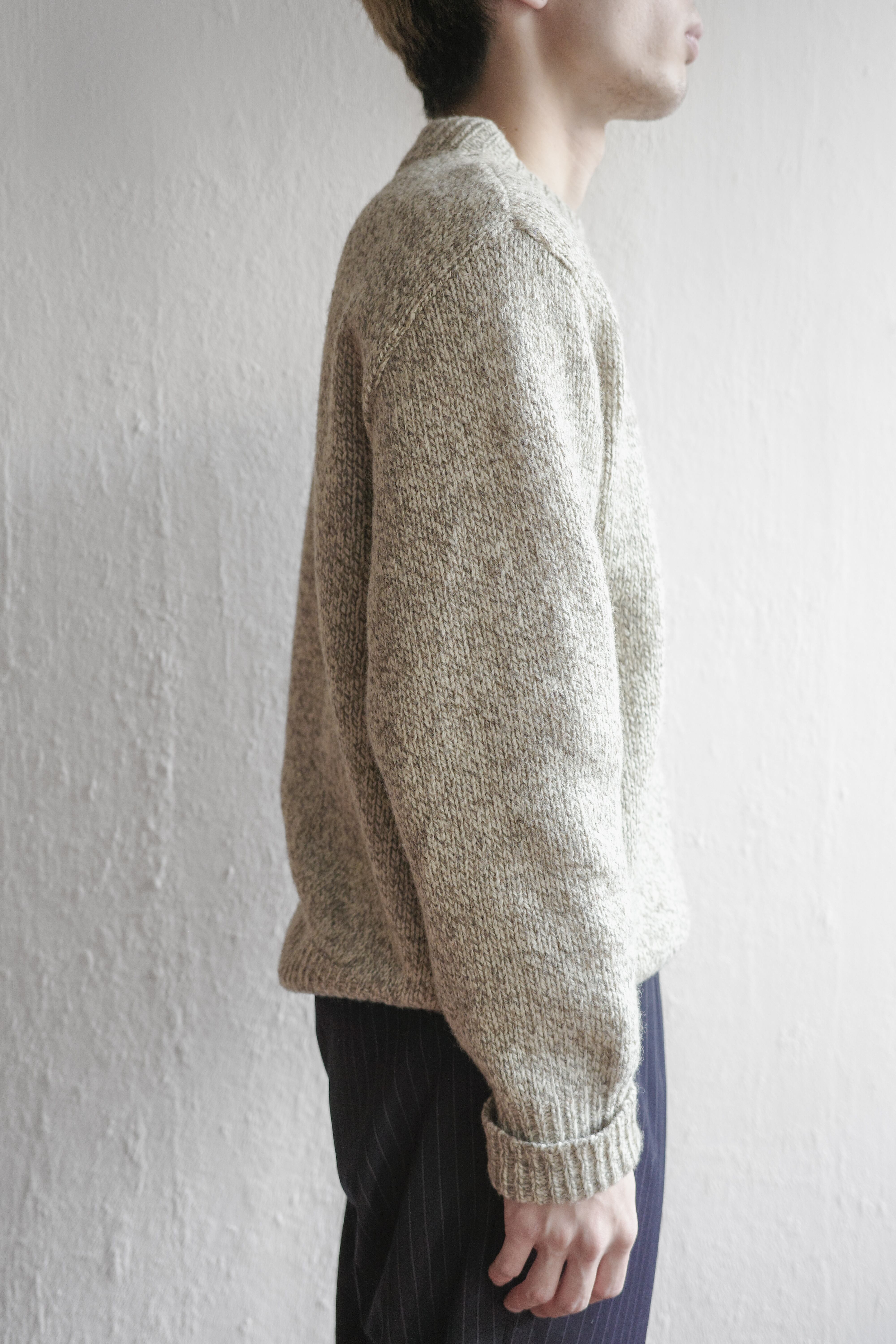 そしてこちらのアイテムはベージュのメランジデザインにサイズもLと程よいゆとりのあるサイズ感です。首元の詰まったデザインに柔らかなウール生地は、着心地も日常的に着用できるほど、着用者にストレスなく使っていただける気遣いとクオリティの高さが伺えます。