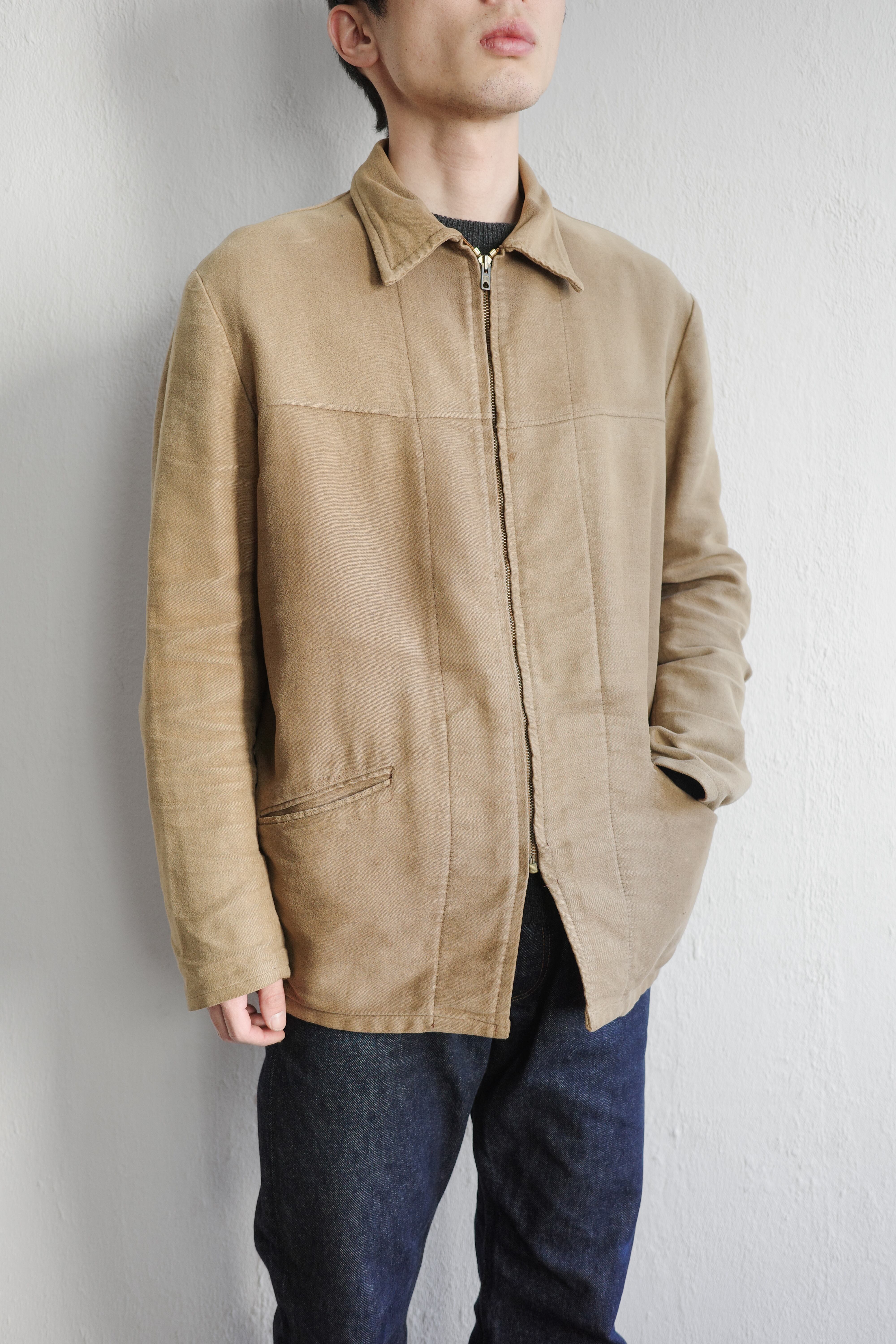 モールスキンはスエードやピーチスキンのような肌触りの高密度で織られた中厚手のコットンの布地です。フランスのワークウエアの代表的な素材でもあります。最近では色々なブランドでこのフレンチモールスキンジャケットがサンプリングされていることもあり美品状態での入荷も難しくなってきた1枚でもあります。