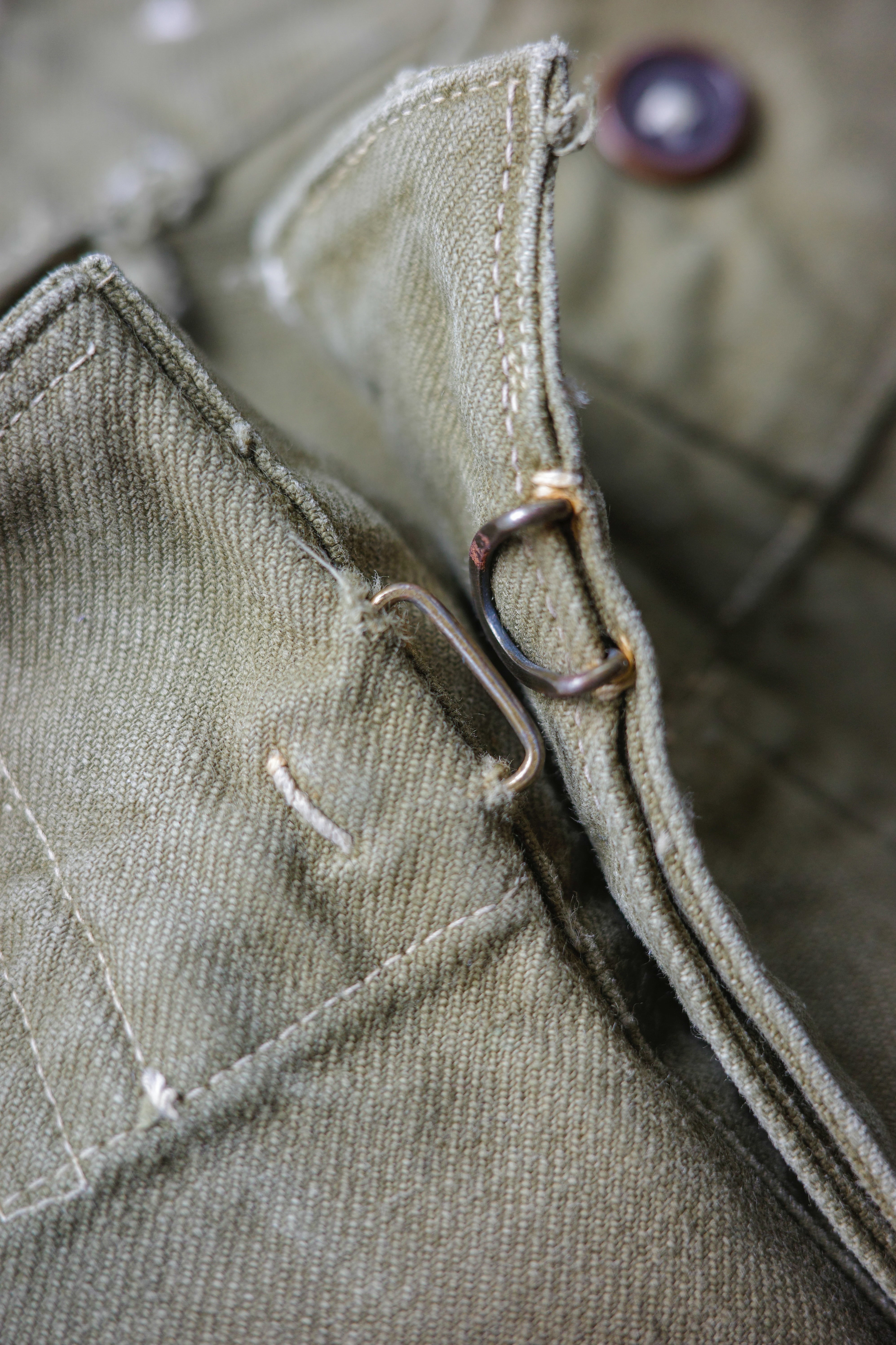 こちらは推定50年代頃のコットンツイルのワークパンツになります。色がカーキと珍しいカラーリングで、ベルトループのないヴィンテージらしいデザインになっています。